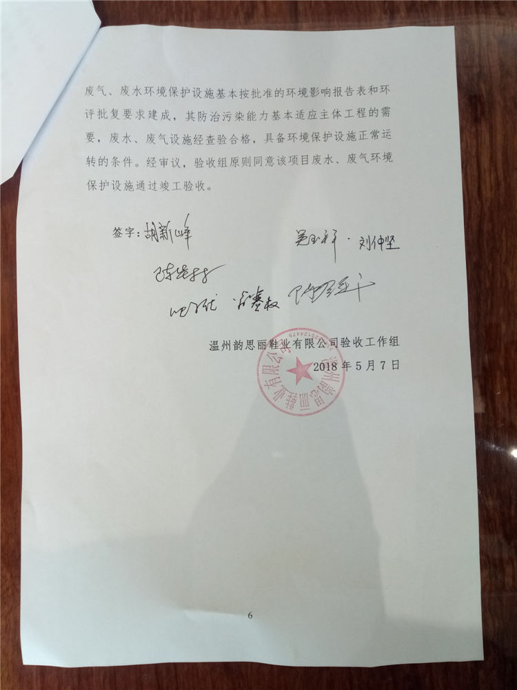 經(jīng)資料查閱和現(xiàn)場核查,溫州韻思麗鞋業(yè)有限公司年產(chǎn)女鞋20萬雙建設(shè)項(xiàng)目環(huán)評手續(xù)齊備,技術(shù)資料基本齊全,廢氣、廢水環(huán)境保護(hù)設(shè)施基本按批準(zhǔn)的環(huán)境影響報告表和環(huán)評批復(fù)要求建成,其防治污染能力基本適應(yīng)主體工程的需要,廢水、廢氣設(shè)施經(jīng)查驗(yàn)合格,具備環(huán)境保護(hù)設(shè)施正常運(yùn)轉(zhuǎn)的條件。經(jīng)審議,驗(yàn)收組原則同意該項(xiàng)目廢水、廢氣環(huán)境保護(hù)設(shè)施通過竣工驗(yàn)收。