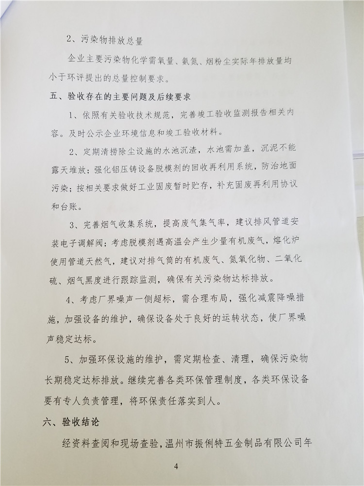 2018年6月12日,溫州市振俐特五金制品有限公司根據(jù)年產(chǎn)拉手1330萬個建設(shè)項目竣工環(huán)境保護驗收監(jiān)測報告并對照《建設(shè)項目竣工環(huán)境保護驗收暫行辦法》,嚴格依照國家有關(guān)法律法規(guī)、建設(shè)項目竣工環(huán)境保護驗收技術(shù)規(guī)范/指南、項目環(huán)境影響評價報告表和審批部門審批決定等要求對本項目竣工環(huán)境保護進行自主驗收,提出自主驗收意見如下: