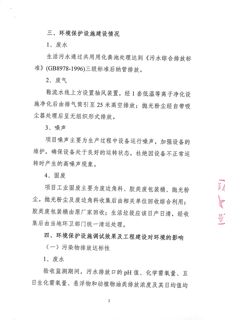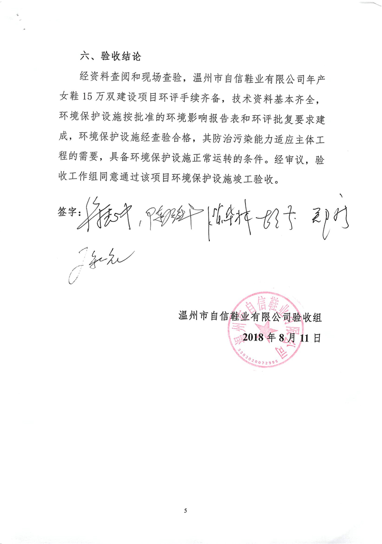 2018年8月11日,溫州市自信鞋業(yè)有限公司根據(jù)項(xiàng)目竣工環(huán)境保護(hù)驗(yàn)收監(jiān)測(cè)報(bào)告并對(duì)照《建設(shè)項(xiàng)目竣工環(huán)境保護(hù)驗(yàn)收暫行辦法》,依照國(guó)家有關(guān)法律法規(guī)、建設(shè)項(xiàng)目竣工環(huán)境保護(hù)驗(yàn)收技術(shù)指南、項(xiàng)目環(huán)境影響報(bào)告表和審批部門審批決定等要求對(duì)本項(xiàng)目竣工環(huán)境保護(hù)設(shè)施進(jìn)行自主驗(yàn)收,提出自主驗(yàn)收意見如下: