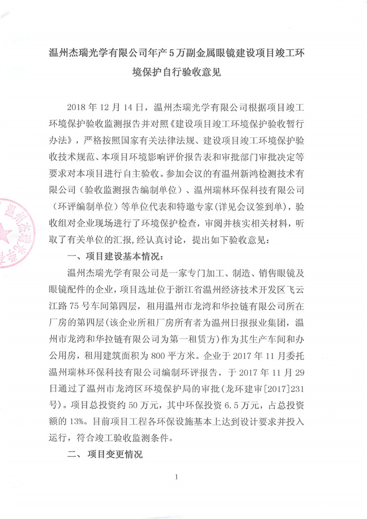 溫州杰瑞光學(xué)有限公司年產(chǎn)5萬副金屬眼鏡建設(shè)項(xiàng)目竣工環(huán)境保護(hù)自行驗(yàn)收— —公示